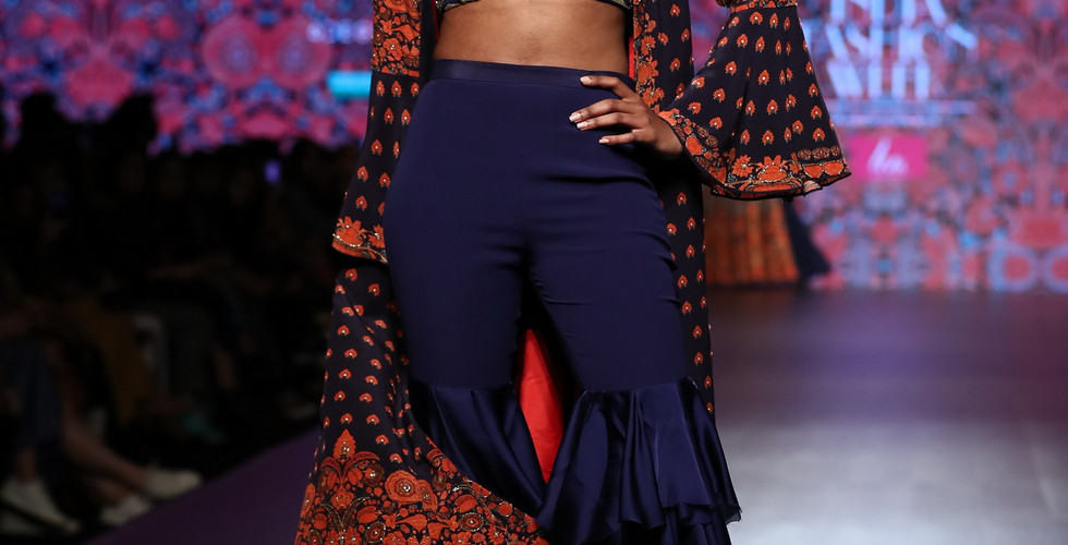 Charu Parashar is pleased to announce the launch of its new collection AW 19 “AVANTA GARDISTE”, she derived her collection inspiration from the “Chintz” floral Calico textiles of 19th Century, taken this concept cleverly and transformed it totally on a deep luxurious background of colours and created a stunning AW’ 19 look. The collection features age old techniques of hand embroideries and Indian handlooms fabrics to create s stunning prêt and diffusion look, with this print of Floral and Chintz she is re-inventing the old silhouettes to create a new look has been the endeavour behind this collection. The main colours in the overall theme are navy blue, red and sea green.